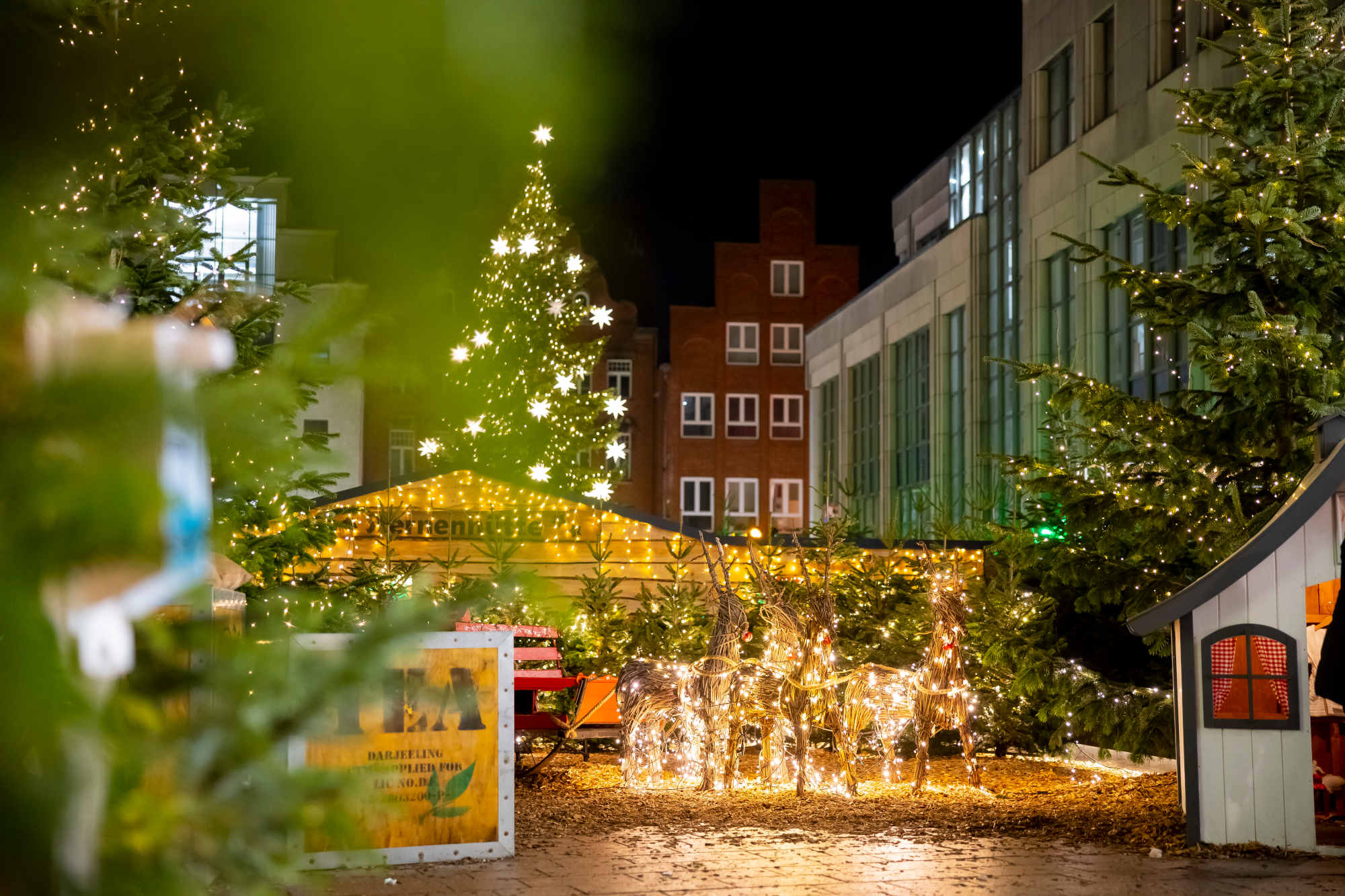 Festive lights twinkle among the green fir trees in a Christmas forest setting, with starry huts dotted in between. Stay awhile and enjoy the vast selection of food and drinks in the forest, there is plenty of seating and covered lounge areas around. The red commercial huts sell individual Christmas gifts from charitable organisations. Buying something while doing good to others is especially rewarding at Christmas!
